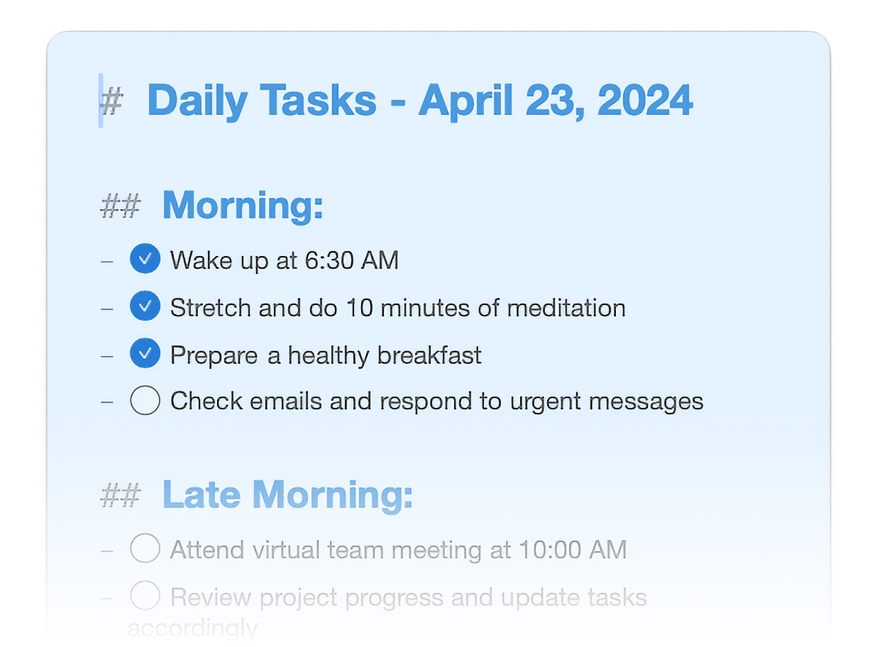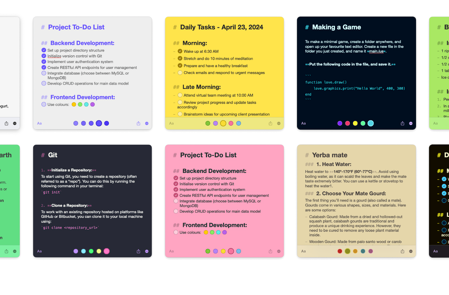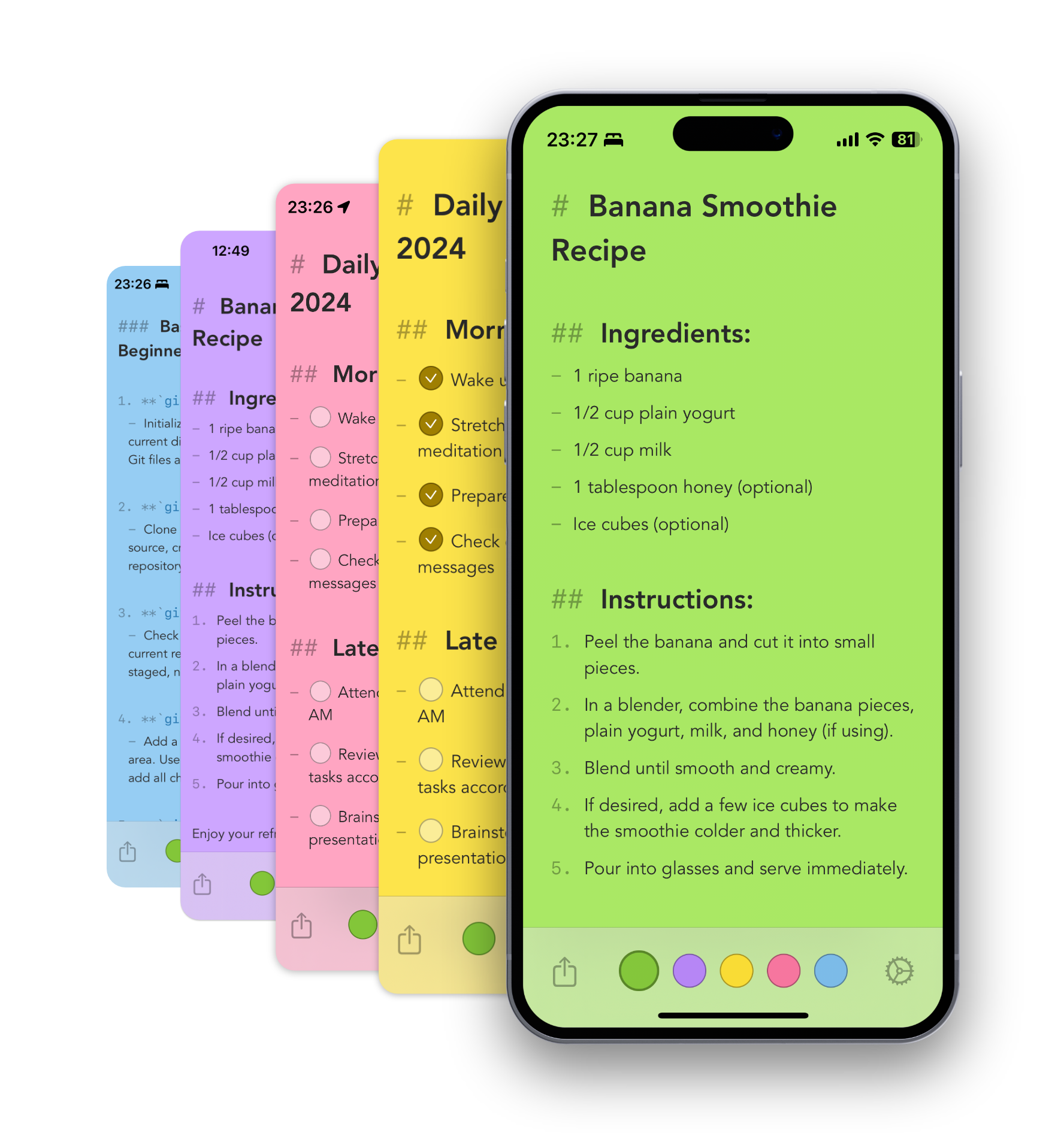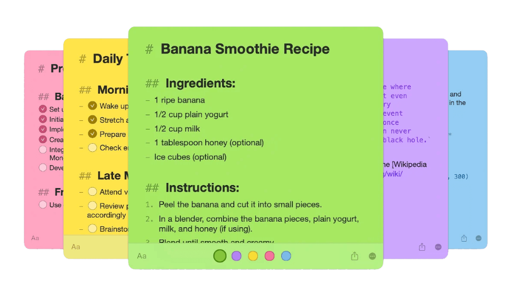 FiveNotes 支持 Markdown 格式化,你可以使用 Markdown 语法快速对笔记进行格式化,例如加粗、斜体、列表等,让笔记内容更加清晰易读。同时,结合丰富的主题,你可以根据自己的喜好调整笔记的外观,使其更具个性化。