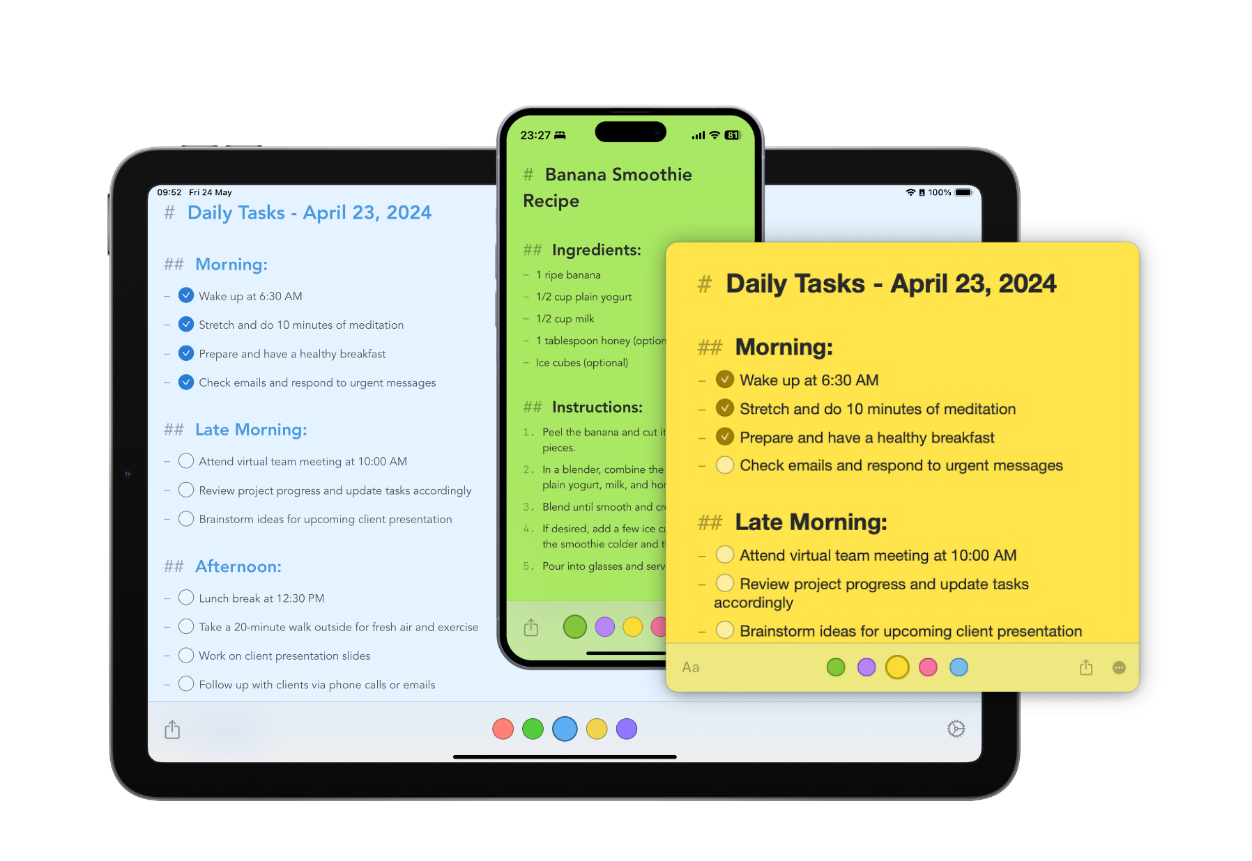 FiveNotes 还推出了移动版应用,支持 iPhone 和 iPad 设备。你可以将笔记随身携带,随时随地记录那些稍纵即逝的灵感。无论是在路上、在会议中,还是在任何其他场景下,只要有灵感,就可以立即打开 FiveNotes 移动版,快速记录下来。之后,你可以在电脑上通过 iCloud 同步查看和整理这些笔记。
