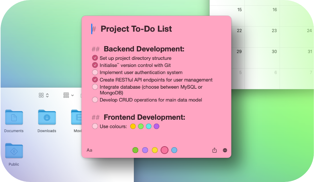 FiveNotes 的窗口可以悬浮在其他应用之上,不会被其他窗口遮挡。你可以通过点击右上角的固定按钮或在设置中启用“始终置顶”功能,确保笔记窗口始终保持可见。此外,你还可以自由调整窗口大小,并将其拖动到屏幕的任何位置,方便你根据需要进行布局。